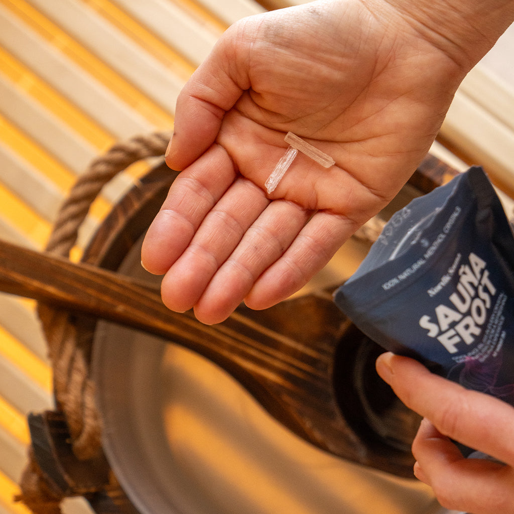 Med Sauna Frost upplever du den rena kraften av mentolkristaller. En naturlig produkt baserad på eterisk olja, extraherad från åkermynta. Känd för sin fräscha, kyliga doft och dess förmåga att öppna luftvägarna, erbjuder Sauna Frost en förnyad och uppfriskande bastuupplevelse.